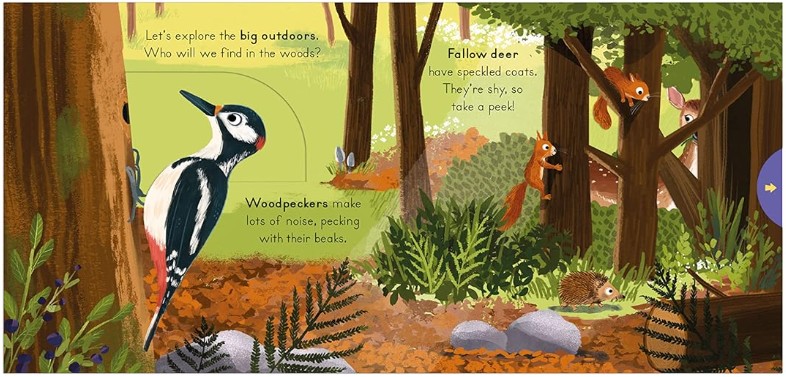 In this first woodland book, there are shy deer to find hiding in the trees, a noisy woodpecker pecking on a tree trunk, moles digging holes and many more woodland creatures to bring to life with the moving parts. |