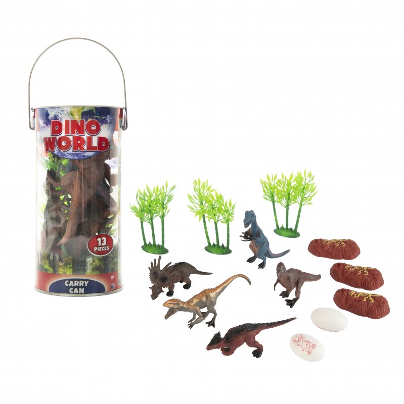 A carry tube containing 13 plastic figures including dinosaurs and plants, perfect for imaginative play.