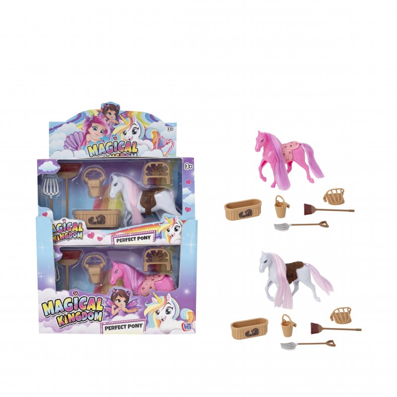 Boxed toy containing a pony and stabling tools. An assortment of 2 colours, white and pink.