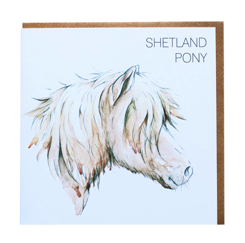 A contemporary watercolour illustration, featuring a Shetland Pony. This card has been left blank inside, for your own personal message.