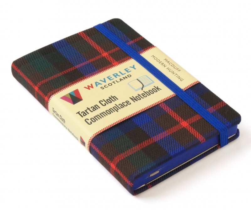 The Waverley Scotland Tartan Cloth Commonplace Notebooks each with 176 pages (left blank, right ruled), acid free, threadsewn, 80gsm cream shade pages, are bound in genuine SCottish tartan cloth over board with round cornered covers and bookblock corners, stained edges and a matching leastic enclosure. Each volume has a ribbon marker and an expandable inner note holder made of cardboard and cloth, and removable booklet with background notes, a Clan Map of Scotland, and with an individual bookmark giving detail on the specific tartan used for the binding. |