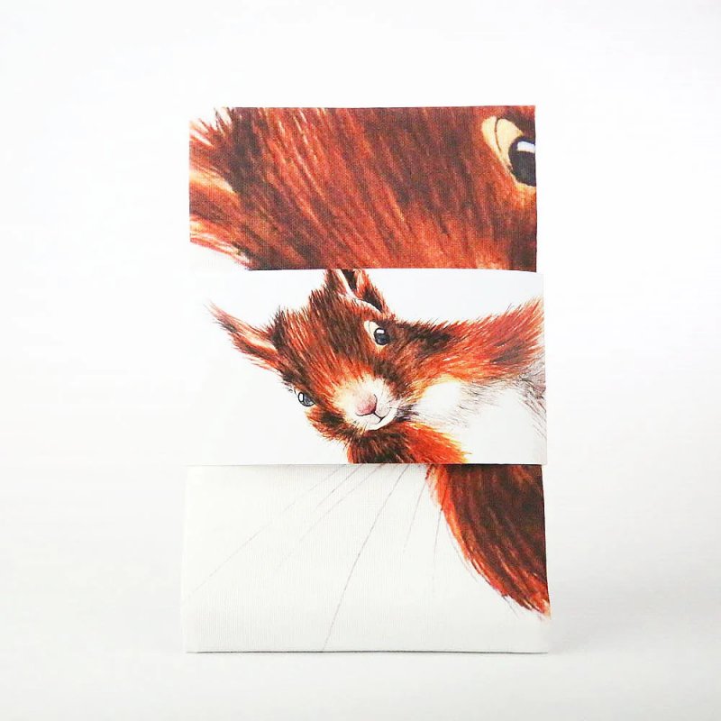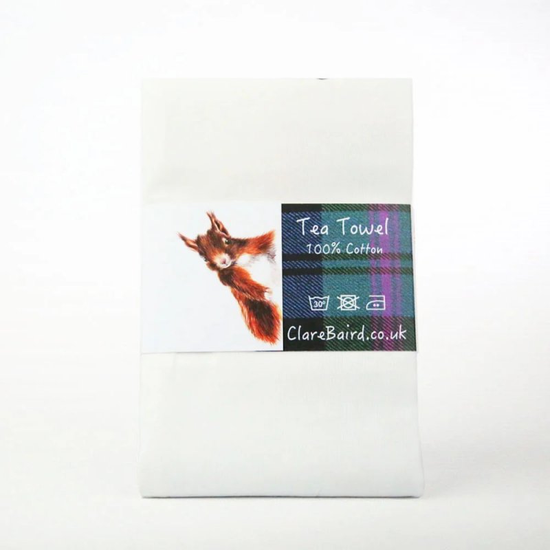 This stunning vibrant & colourful watercolour red squirrel tea towel design, painted by Scottish artist Clare Baird.