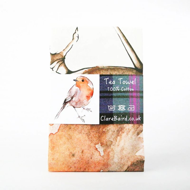 This stunning vibrant & colourful watercolour robin tea towel design, painted by Scottish artist Clare Baird.