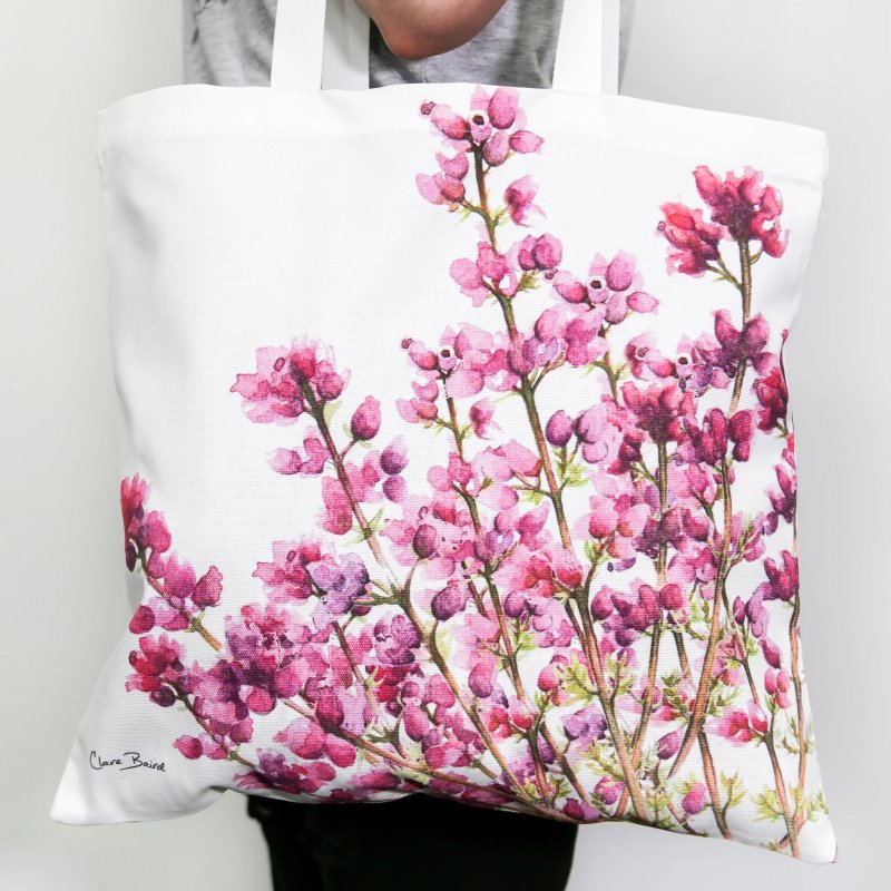 Luxury tote bag featuring the modern and bright watercolour illustrations of Scottish artist Clare Baird. The bags are 100% cotton and feature the Scottish heather design. A perfect Scottish gift!