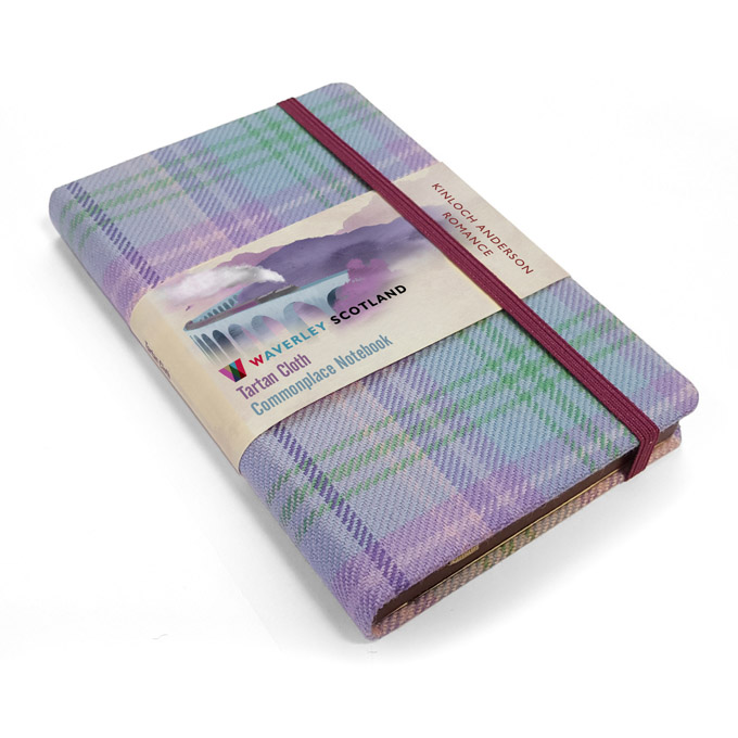 The Waverley Scotland Tartan Cloth Commonplace Notebooks each with 176 pages (left blank, right ruled), acid free, threadsewn, 80gsm cream shade pages, are bound in genuine SCottish tartan cloth over board with round cornered covers and bookblock corners, stained edges and a matching leastic enclosure. Each volume has a ribbon marker and an expandable inner note holder made of cardboard and cloth, and removable booklet with background notes, a Clan Map of Scotland, and with an individual bookmark giving detail on the specific tartan used for the binding.