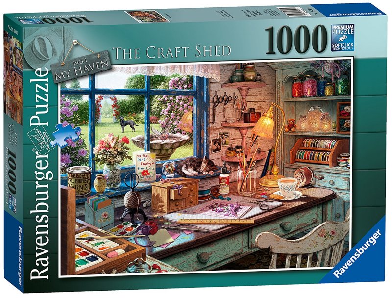 A bench strewn with crafting supplies looks out onto a sunny garden in this homely and warm jigsaw.