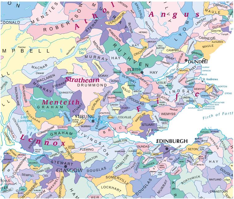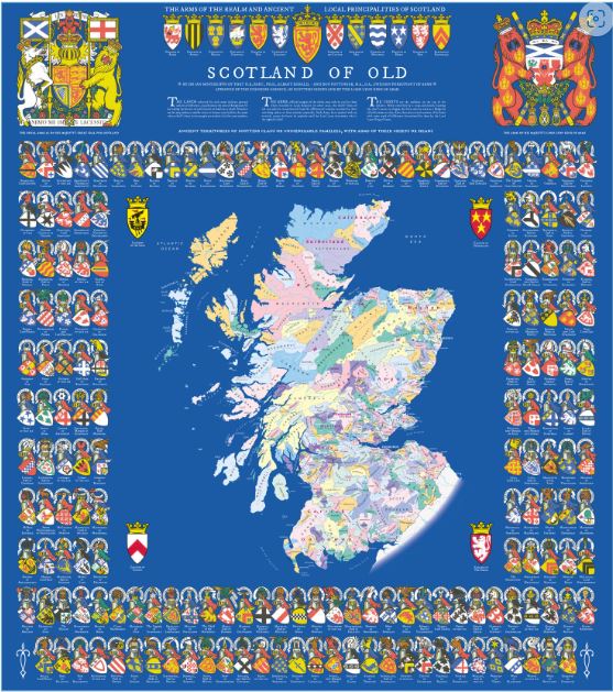 Double sided combined map featuring the Scotland of Old Map on one side and the Tartans Map on the other. Discover Scotland with this authoritative guide to clans, tartans, and their origins. These popular maps are highly detailed, showing hundreds of arms, official insignia, crests, and tartans of the Scottish clans. This beautifully illustrated map is both decorative and informative. |