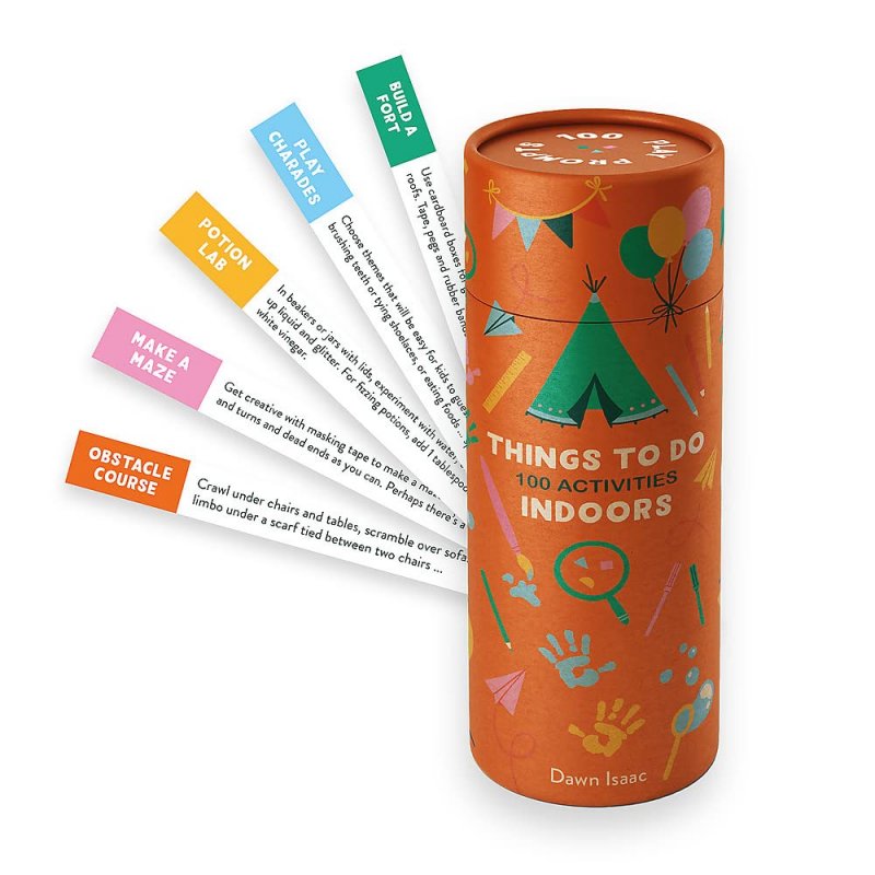 'I'm bored' must be the most frightening words in a child's vocabulary, and how to keep kids entertained is something that keeps many of us awake at night. 100 Things to Do Indoors is a collection of games, activities, prompts and projects to keep little and not-so-little ones focused, busy and happy. From simple and silly things to distract them for ten minutes to crafts and experiments to keep them entertained for an afternoon, there's a boredom buster for everyone. Pick a play prompt strip to give you all the inspiration you need whether you're a parent, a grandparent, a childcare worker or simply the one in charge of a child for a day!Not every activity will suit your day - or their mood - so just turn the stick over or choose another one from the pot. If you don't know how to make rainbow crayons, a calming jar or bath paints, no problem. There's a handy booklet with all the instructions you'll need for all sorts of projects. |