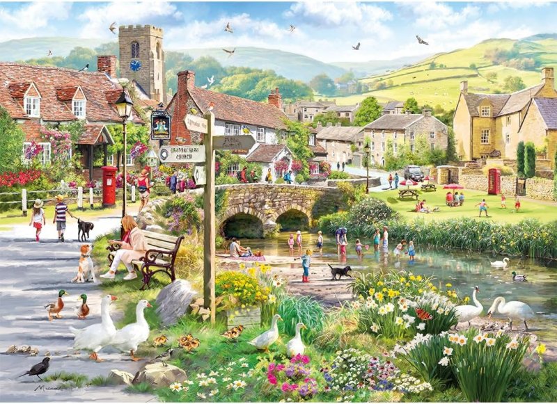 Welcome to a delightful day in the village! Ducks (and children!) paddle happily in the stream, while the villagers enjoy a leisurely day of rural life, soaking up the peaceful surroundings. Beautiful artwork painted by the talented artist Richard Macneil. This 1000-piece jigsaw is fantastic whether for personal enjoyment, challenge or as a thoughtful present. It makes an excellent choice for jigsaw puzzle enthusiasts and art lovers alike, parents, grandparents, friends, family, and couples. |