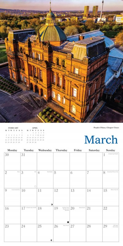 Enjoy wonderful scenic images throughout the year with our range of 2026 calendars. This 24 page wall calendar offers a full page for an image and a full page of date boxes below. The calendar dimensions are 30cm x 30cm (60cm x 30cm when opened). The selection of stunning images of Glasgow included are: PS Waverley and Glasgow Science Centre; Heavy Horse, Easterhouse; People's Palace, Glasgow Green; Tolbooth Steeple, Glasgow Cross; Kelvingrove Art Gallery and Museum; Duke of Wellington Statue, Royal Exchange Square; Blythswood Square; Floating Taxi by Rouge-One, Mitchell Street; Armadillo, Finnieston Crane, OVO Hydro and the River Clyde; Kibble Palace, Glasgow Botanic Gardens; Tall Ship Glenlee and Riverside Museum; the Pipe Bridge and the River Clyde. Our 2026 Lomond Calendars are in plastic free packaging. |