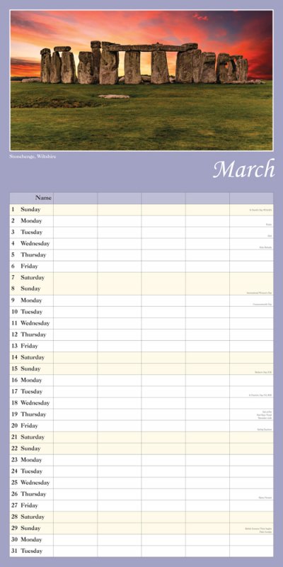 Enjoy wonderful scenic images throughout the year with our range of 2026 calendars. This 24 page wall calendar offers a full page for an image and a full page of date boxes below. The calendar dimensions are 30cm x 30cm (60cm x 30cm when opened). The grid contains columns 5 for family members to keep track of everyone's appointments and engagements. The stunning images of England included are: River Tyne, Newcastle; Skiddaw and Derwent Water, Cumbria; Stonehenge, Wiltshire; High Peak, Derbyshire; Durdle Door, Dorset; Pulteney Bridge, Bath, Somerset; Castle Combe, the Cotswolds; Dartmouth, Devon; Old Harry Rocks, Isle of Purbeck, Dorset; Warwick Castle, Warwickshire; Bourton-on-the-Water, the Cotswolds; River Thames, London. Our 2026 Lomond Calendars are in plastic free packaging. |