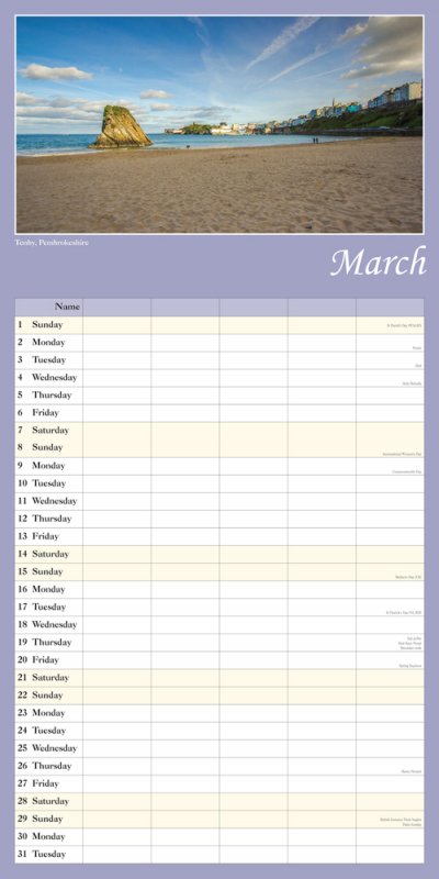Enjoy wonderful scenic images throughout the year with our range of 2026 calendars. This 24 page wall calendar offers a full page for an image and a full page of date boxes below. The calendar dimensions are 30cm x 30cm (60cm x 30cm when opened). The grid contains columns for family members to keep track of everyone's appointments and engagements. The stunning images of Wales included are: Eryri National Park; Caernarfon Castle, Gwynedd; Tenby, Pembrokeshire; Deganwy, Conwy; The Lonely Tree, Llyn Padarn, Gwynedd; Portmeirion Village, Gwynedd; Llangrannog, Ceredigion; Twr Mawr, Anglesey; Aberystwyth, Ceredigion; Mount Tryfan, Ogwen Valley, Eryri; Conwy Castle, Conwy; Cardiff. Our 2026 Lomond calendars are in plastic free packaging.