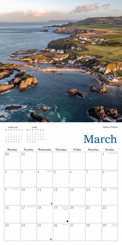 Enjoy wonderful scenic images throughout the year with our range of 2026 calendars. This 24 page wall calendar offers a full page for an image and a full page of date boxes below. The calendar dimensions are 30cm x 30cm (60cm x 30cm when opened). The selection of stunning images of Northern Ireland included are: Hare's Gap, Mournes; the Peace Bridge, Derry-Londonderry; Ballintoy Harbour; Torr Head, Part-Aleen Bay; the Giant's Causeway; Dunluce Castle; Navan Fort, Armagh; Downhill Strand, Castlerock; Slemish Mountain, Ballymena; the Dark Hedges, Stranocum; Blackhead Lighthouse, Belfast Lough; Enniskillen Castle, Lough Erne. Our 2026 Lomond Calendars are in plastic free packaging.