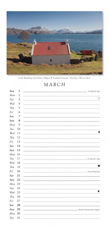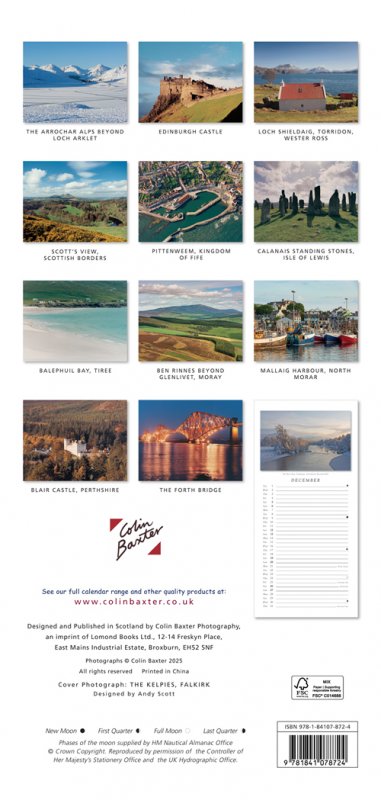 From renowned Scottish photographer Colin Baxter, our range of calendars are fantastic additions to any home or office. This is 12 page, wire-bound appointments style calendar with an image at the top of each month's page and a grid below for engagements and plans. The calendar's dimensions are 34.6cm x 16.5cm. Our 2026 range come in plastic-free packaging. Colin's selection of stunning images of Scotland are: the Arrochar Alps beyond Loch Arklet; Edinburgh Castle; Loch Shieldaig, Torridon, Wester Ross; Scott's View, Scottish Borders; Pittenweem, Kingdom of Fife; Calanais Standing Stones, Isle of Lewis; Balephuil Bay, Tiree; Ben Rinnes beyond Glenlivet, Moray; Mallaig Harbour, North Morar; Blair Castle, Perthshire; the Fort Bridge; the River Spey, Cairngorms National Park. |