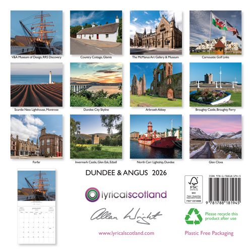 Featuring spectacular photography by Allan Wright, our range of 2026 calendars lets you bring Scotland in all its beauty into your home for the whole year. Our Lyrical Scotland range are 24 page wall calendars, offering a full page for the image and a full page for date boxes below. This range are supplied in plastic free envelopes suitable for posting, which can be opened to enclose a card or message and then resealed before sending. Our 2026 selection of images for Dundee and Angus are: V&A Museum of Design, RRS Discovery; Country Cottage, Glamis; the McManus Art Gallery and Museum; Carnoustie Golf Links; Scurdie Ness Lighthouse, Montrose; Dundee City Skyline; Arbroath Abbey; Broughty Castle, Broughty Ferry; Forfar; Invermark Castle, Glen Esk, Edzell; North Carr Lightship, Dundee; Glen Clova. Calendar dimensions are 24cm x 24cm (48cm x 24cm when opened). |