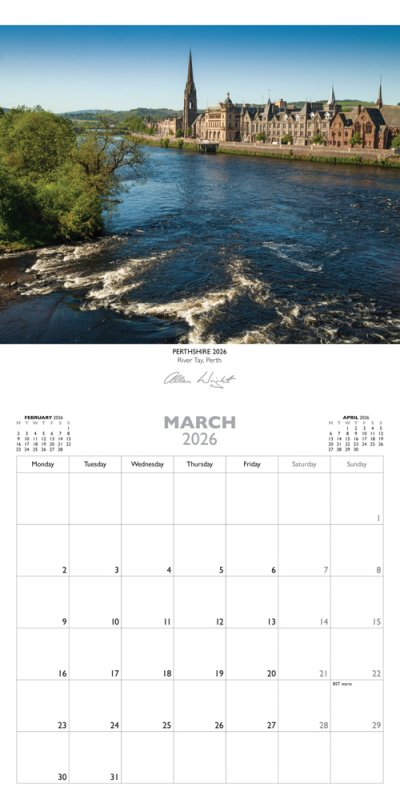 Featuring spectacular photography by Allan Wright, our range of 2026 calendars lets you bring Scotland in all its beauty into your home for the whole year. Our Lyrical Scotland range are 24 page wall calendars, offering a full page for the image and a full page for date boxes below. This range are supplied in plastic free envelopes suitable for posting, which can be opened to enclose a card or message and then resealed before sending. Our 2026 selection of images for Perthshire are: Croft Moraig Stone Circle, by Kenmore; Queen's View, Loch Tummel; River Tay, Perth; Ossian's Hall, Back Linn Falls, Dunkeld; Kinnoull Hill, River Tay; Balvaird Castle; Barley Field, Carse of Gowrie; Blair Castle, Blair Atholl; Crieff; Ben Vrackie, Atholl Palace Hotel, Pitlochry; Blairgowrie; Ben Lawers, Loch Tay. Calendar dimensions are 24cm x 24cm (48cm x 24cm when opened). |