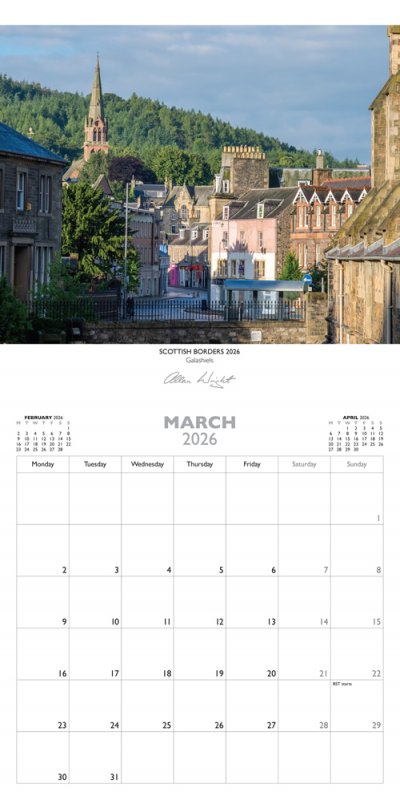 Featuring spectacular photography by Allan Wright, our range of 2026 calendars lets you bring Scotland in all its beauty into your home for the whole year. Our Lyrical Scotland range are 24 page wall calendars, offering a full page for the image and a full page for date boxes below. This range are supplied in plastic free envelopes suitable for posting, which can be opened to enclose a card or message and then resealed before sending. Our 2026 selection of images for the Scottish Borders are: St Mary's Loch; Traquair House; Galashiels; Jedburgh Abbey; Eyemouth; Greenknowe Tower, Gordon; Floors Castle; Abbotsford House, Melrose; Melrose Abbey; Scott's View to the Eildon Hills; River Tweed, Peebles; Scott Brash, Peebles. Calendar dimensions are 24cm x 24cm (48cm x 24cm when opened). |